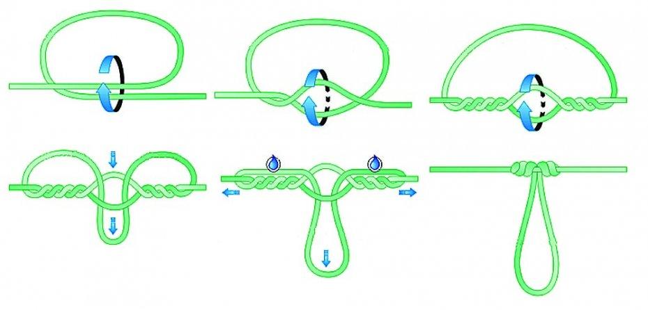 — в выбранном месте крепления поводка на основной леске формируется петля, в которую с одной стороны трижды заводится свободный конец лески (как при завязывании тройного узла);