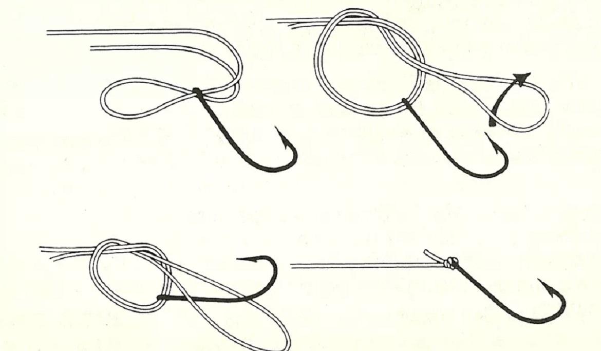 - После этого конец лески нужно продеть через получившуюся петельку, в результате чего образуется еще одна петля, сквозь которую нужно продеть конец лески еще раз, как показано на рисунке выше;