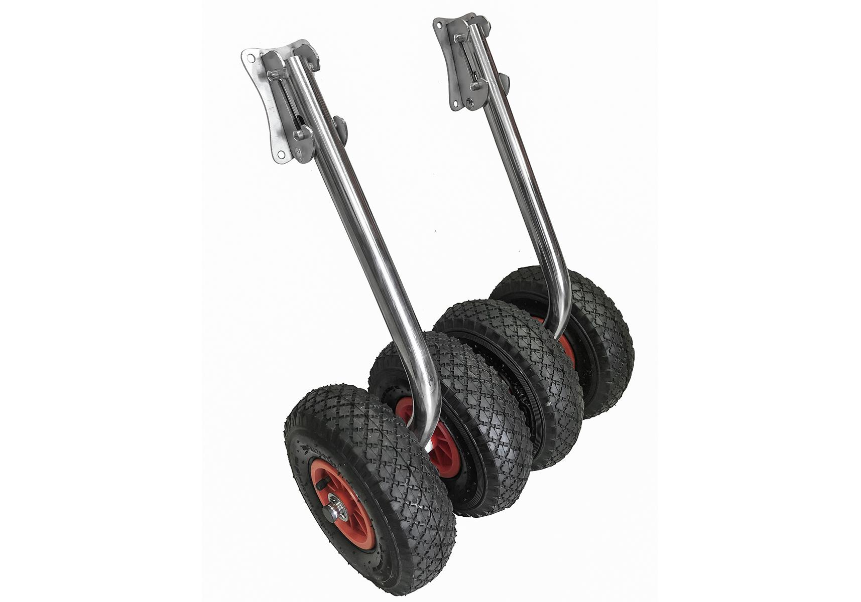 Приспособление монтируется с внешней стороны транца, что позволяет без проблем складывать колеса снизу-вверх. Чтобы изделие зафиксировать, в конструкции применены пружины, которые располагаются внутри стоек и изготовленные из нержавейки. Следует заметить, что и остальные детали складных колес сделаны из нержавеющей стали, что обеспечивает конструкции завидную прочность и устойчивость, как к пресной воде (KS-03), так и к соленой воде (KS-04).