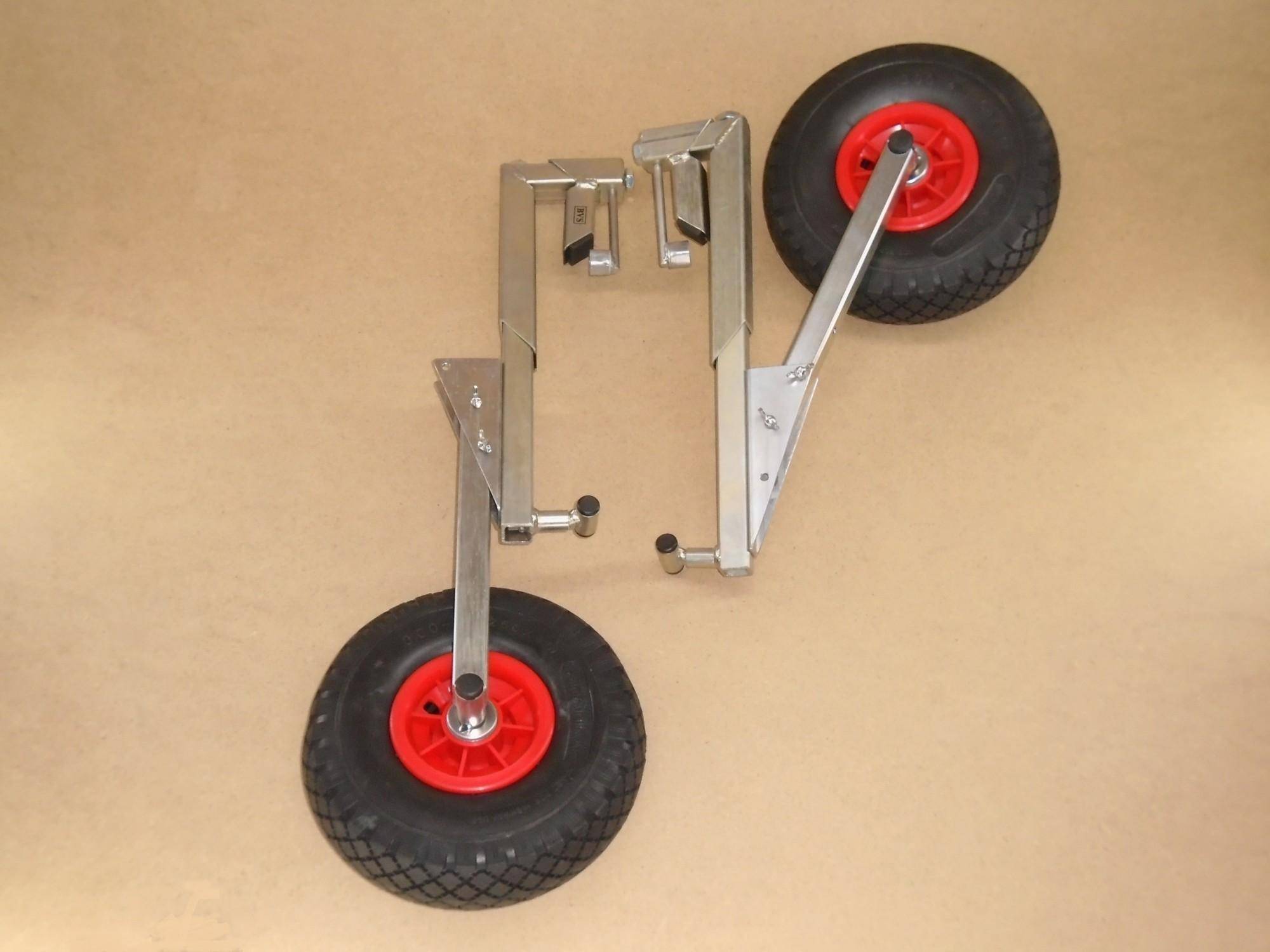 Складные или откидные колеса изначально предполагают, что их можно мобильно использовать. При необходимости передвижения по суше они на специальном креплении откидываются и упираются в землю, а при погружении в воду вертикально поднимаются, не препятствуя свободном плаванию.