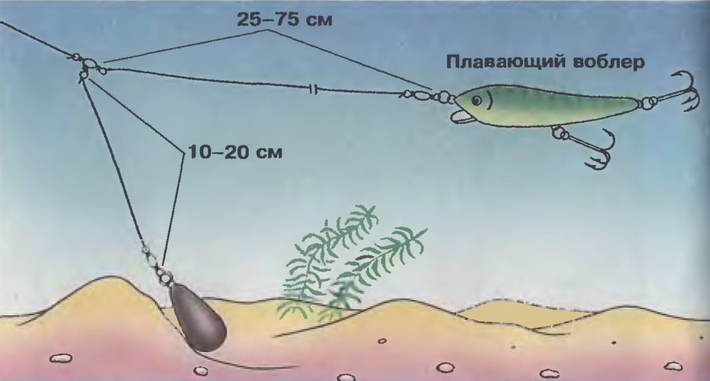 Когда «зубастая» пассивна, можно применять плавающие модели «минноу» с минимальным заглублением и слабовыраженной игрой. В этом случае оснастку комплектуют грузом весом 40–80 г, а приманку монтируют на отводном поводке длиной 80–120 см.