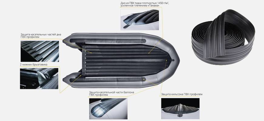 Дно усиливается полностью и частично. Понадобится специальная ПВХ лента, называемая привальным брусом. Толщина составляет до 3 мм, ширина – до 200-230 мм. Лента приклеивается к днищу с помощью специального двухкомпонентного клея. Подобная процедура придает днищу дополнительную жесткость и защищает от возможных повреждений о водные преграды.