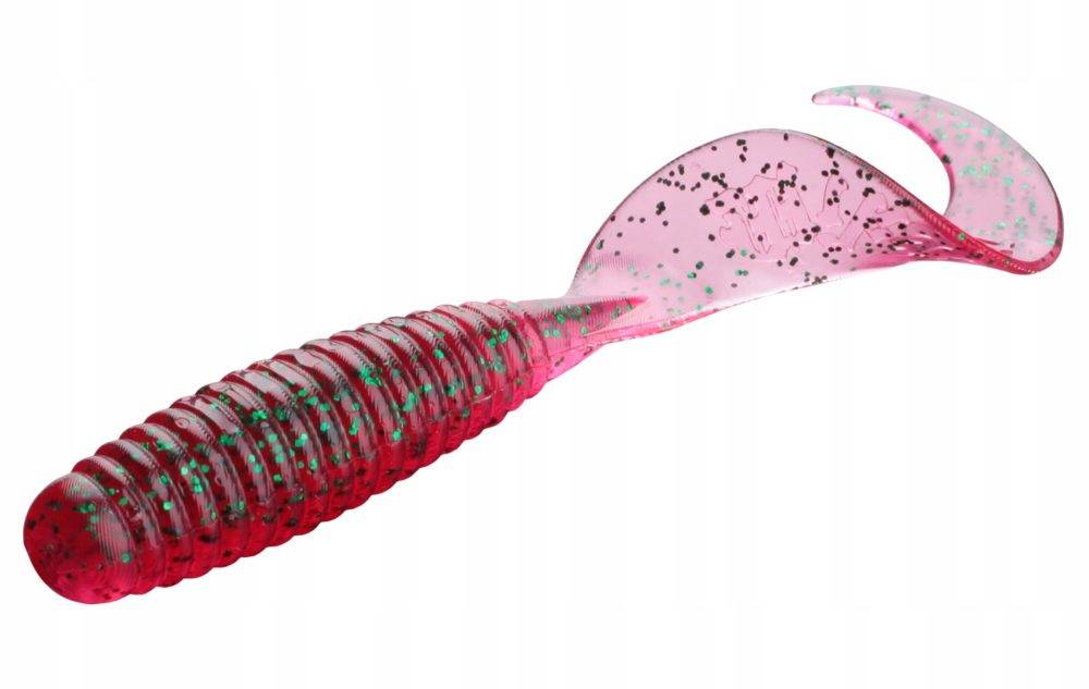 Твистер – это силиконовая рыболовная приманка для ловли на спиннинг джиговым способом. По форме, как и виброхвост, напоминает малька, но имеет парусящий под водой тонкий плоский хвост, который создает высокочастотные вибрации и привлекает хищную рыбу. По размерам варьируется от 1 до 12-15 см при ловле пресноводных хищников. И 20-35 см для морской рыбалки. Расцветки – очень разные.