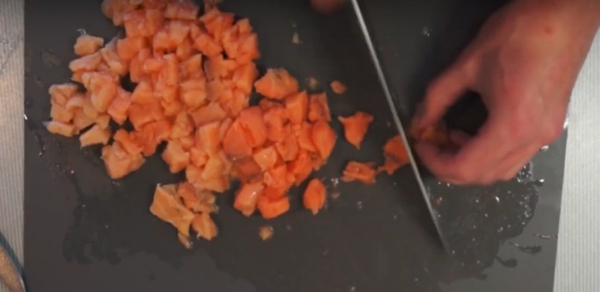1. Рыбу промойте, выпотрошите и разделите на стейки. Отделите мякоть от шкурки и костей, нарежьте на мелкие кусочки.