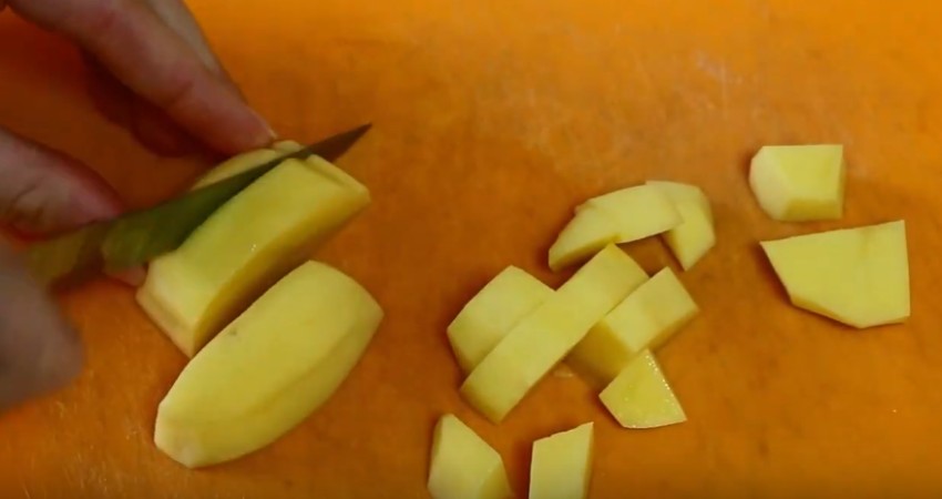 3 ) Картофель освободим от кожуры и нарежем суповыми кубиками.