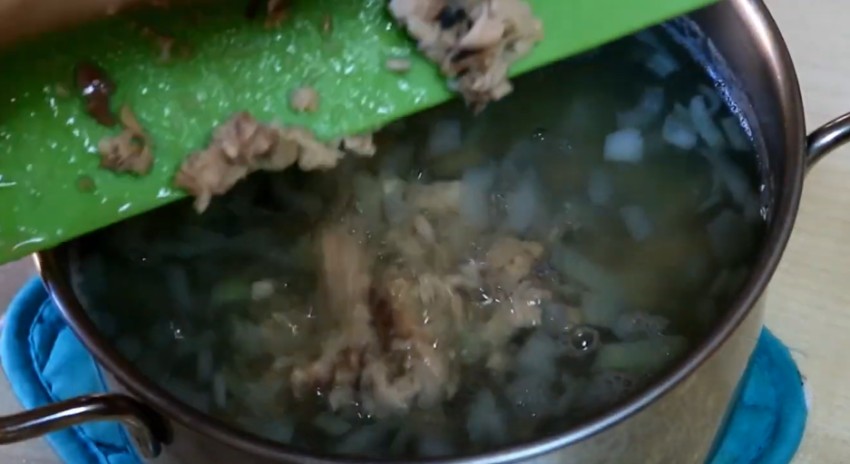 3. Консервированную горбушу разделите на небольшие кусочки. Отправьте к овощам. По желанию, вы можете влить в бульон жидкость от консервы. Дождитесь закипания и варите пару минут.