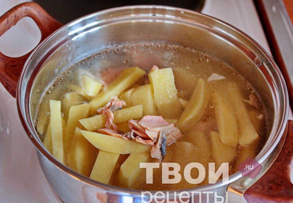 Вернуть мякоть сёмги в кастрюлю. Добавить порезанный брусочками картофель. Варить на умеренной температуре минут 12-15.