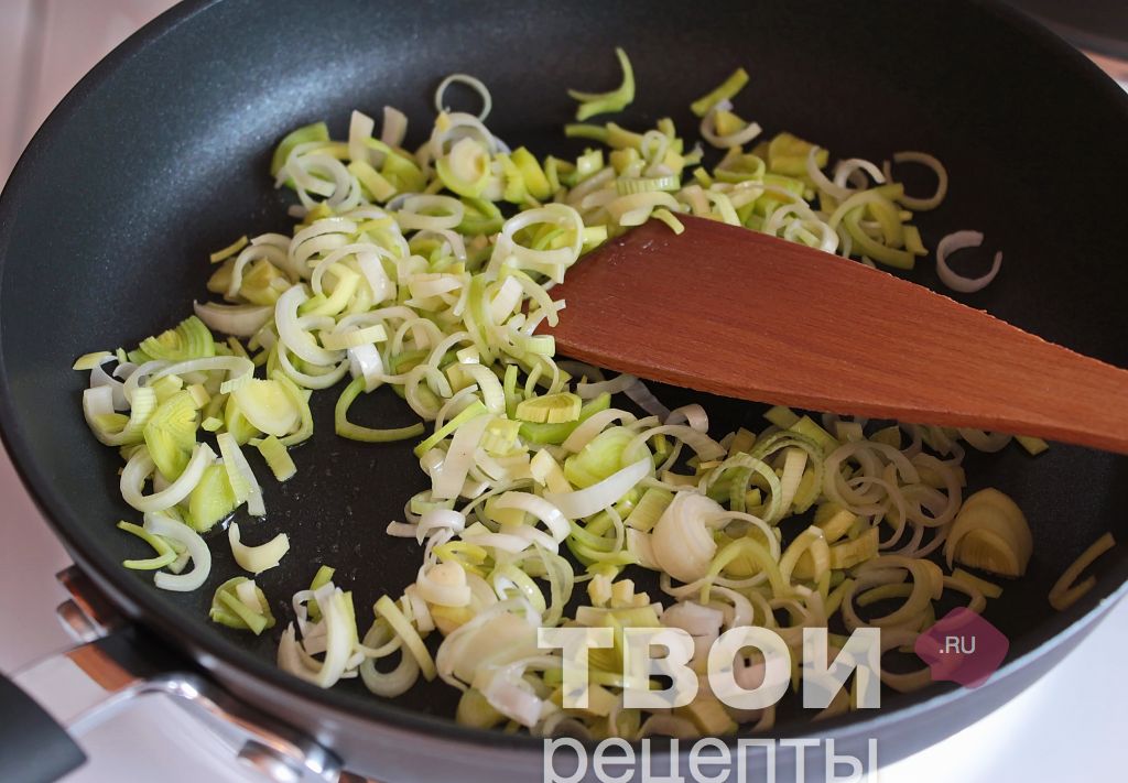 Лук-порей спассеровать на оливковом масле до мягкости.