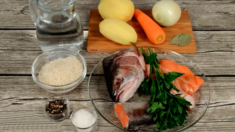 Чтобы разобраться в том, как делается уха из головы и хвоста семги с пшеном, необходимо подготовить следующие ингредиенты.