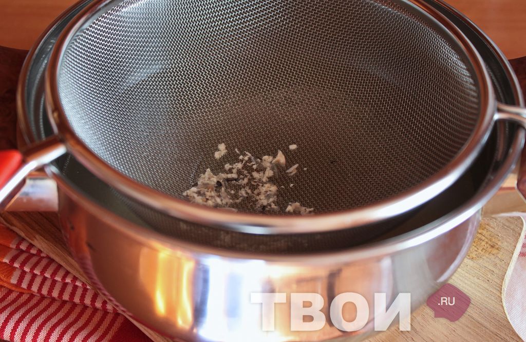 - По завершении 10 мин, головы и хвостовые части требуется достать из кастрюли, а бульон процедить.