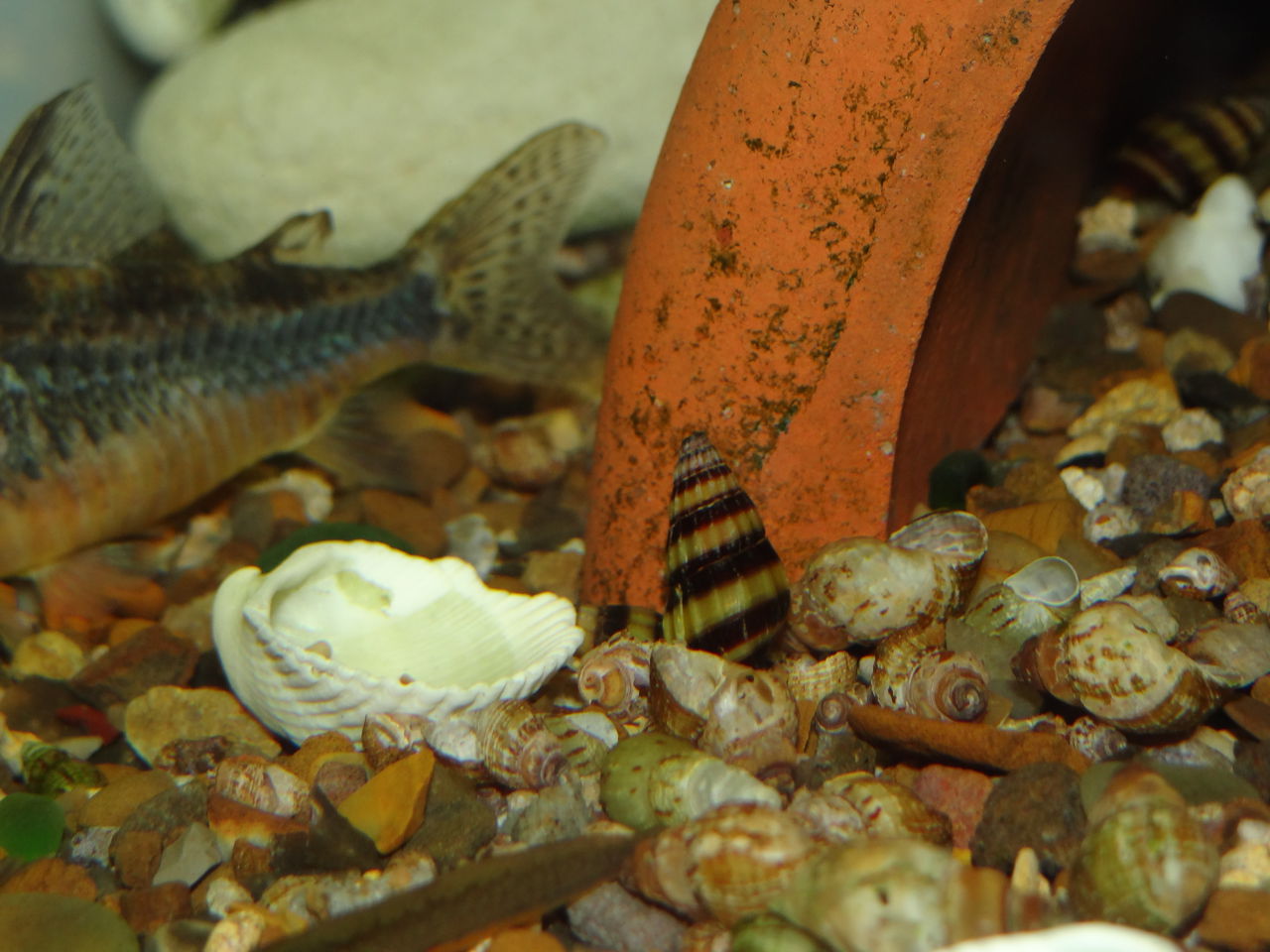 Вторым домыслом является такое распространенное мнение о том, что хелены уничтожают всех других улиток, аквариум некому чистить от зеленных и бурых водорослей, и начинается настоящий бардака. Начнем с того что хелены достаточно медленно справляются с сорными улитками, поэтому полное истребление колоний улиток процесс не одного дня. Теперь хочу разочаровать всех тех людей, которые искренне считают, что улитки вроде физ или катушек прекрасно справляются с нежелательными водорослями. На самом деле сорные улитки предпочитают доедать остатки корма для рыб, а водоросли они едят совсем мелкими дозами, если вы видели своими глазами как катушка проходит по зеленому образованию оставляя за собой след, это не значит, что она питается зеленым налетом на стенках вашего аквариума, а просто ищет в нем пищу попутно приманная своим телом «газон из одноклеточных». Для борьбы с растительным налетом больше подойдут сомики анциструсы, всего одна особь гораздо лучше справится чем несколько тысяч улиток.