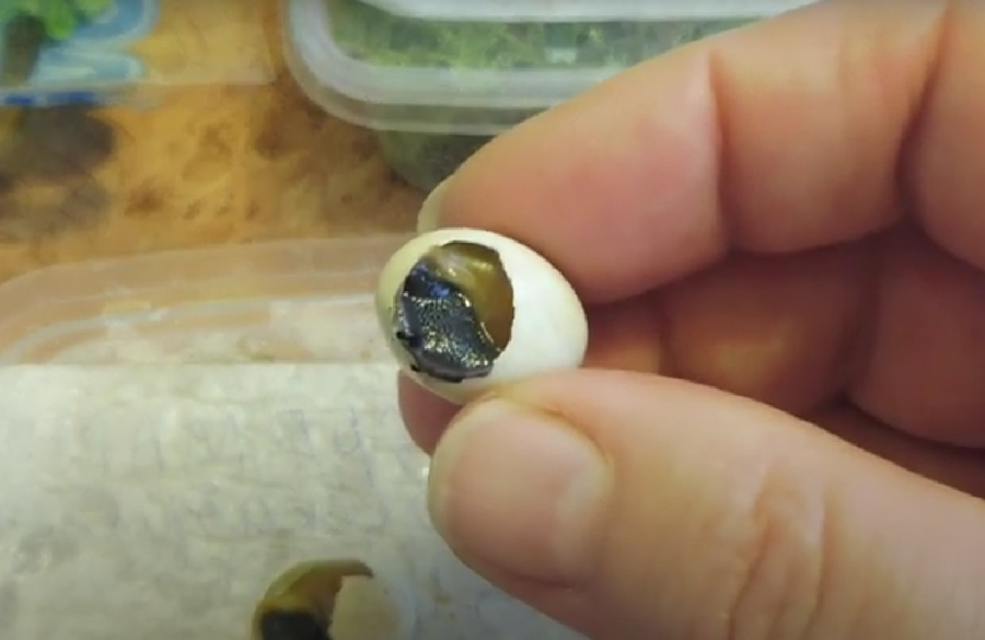 Маленькие новорожденные выползают из грунта через несколько дней после вылупления, а скорлупу съедают, с раковиной молодых питомцев обращайтесь крайне осторожно, в первые дни жизни она хрупкая