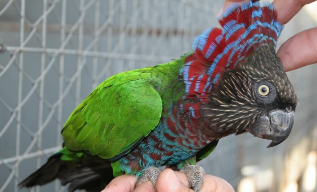 Синеголовый красногузый попугайчик разговаривает отдельными словами. Срок его жизни составляет 35–45 лет. Облик примечателен – пернатый словно составлен из разных частей: