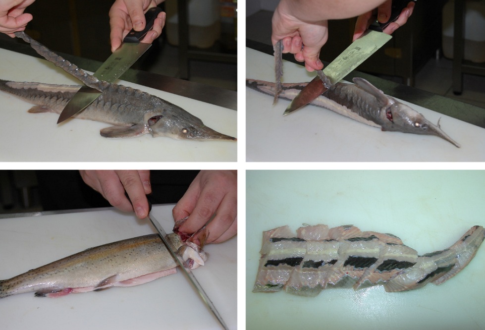 • к крупным осетровым применяется способ пластования, нужно разрезать по спине на 2 половины, хорда легко вынимается целостным шнурком, этот метод можно применять и для свежей рыбы.