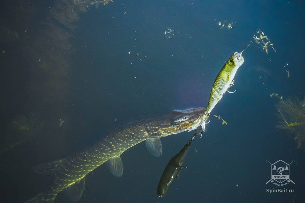 - В этом преимущество воблеров – в отличие от блесен и джига, они поднимают щуку, которая не питается, вызывая агрессию. Щука часто атакует их не чтобы сожрать, а прогнать наглого конкурента, посмевшего вторгнуться во владения и нарушить покой зубастой. Поэтому воблеры на твичинге работают и летом в жару – щука выходит и агрессивно бьет их с разгона рылом, зацепляясь часто за крючки снаружи пасти.