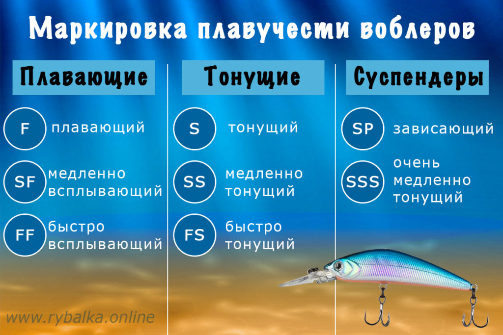На упаковке с воблерами, а иногда и на самой приманке, можно встретить английские буквы, обозначающие степень её плавучести.