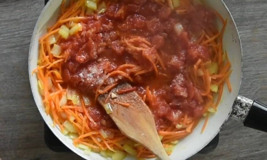 - добавляют 2 ст. л. томатной пасты, 3-4 гвоздики, лавровый лист, 6 горошин перца, соли и тушат до готовности лука;