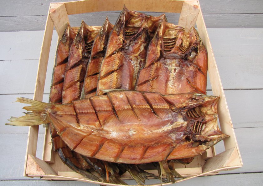 Предпочтительно брать тушки весом до 1,5 кг. Рыбку коптят, вставив в брюшки распорки из деревянных палочек. Или рыбины распластывают в виде книжки, разрезая по животу или спинке. Раскладывают плашмя или подвешивают, предварительно перевязав шпагатом, чтобы тушки не развалились. Коптят 1–6 суток в зависимости от температуры дыма и веса рыбы.