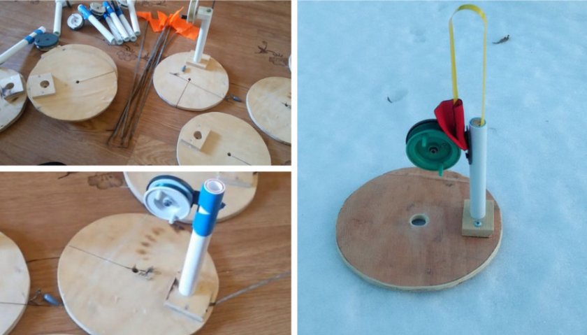 Для основания берётся достаточно толстый пластик — круглый или квадратный кусок. Хорошо подойдёт основание от сломанного электрочайника, другие детали электроприборов. Все они не должны проваливаться в лунку, то есть быть больше неё. К основанию крепится стойка для катушки и флажок. Стойку удобно сделать из куска нетолстой пластиковой трубы из полипропилена на 16 мм.