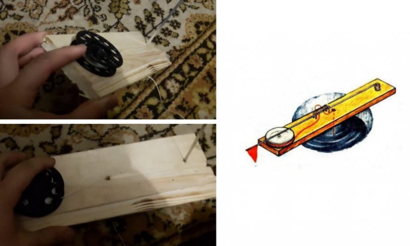 В центральной части доски создайте дыру с диаметром 10 мм. Поменяйте в дрели сверло на 4 мм и сделайте дырки в пластинках крепления катушки. Саморезами прикрутите катушку с заранее накинутой на нее леской на краю доски, разложите ее таким образом, чтобы леска разматывалась снизу и была ближе к проделанному отверстию.