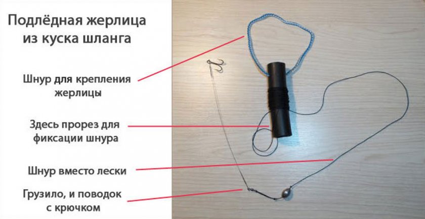 Подледное изделие на щуку создается еще проще. Сначала надо взять основание в форме рейки из дерева или палочки длиной не менее 2 диаметров лунки. По центру нужно привязать плотную леску, к концу которой прикрепляется отрезок одной трубки, обладающей определенной плавучестью. Снизу в ней надо создать небольшой пропил длиной 4 сантиметра. На шланг намотать главную леску.