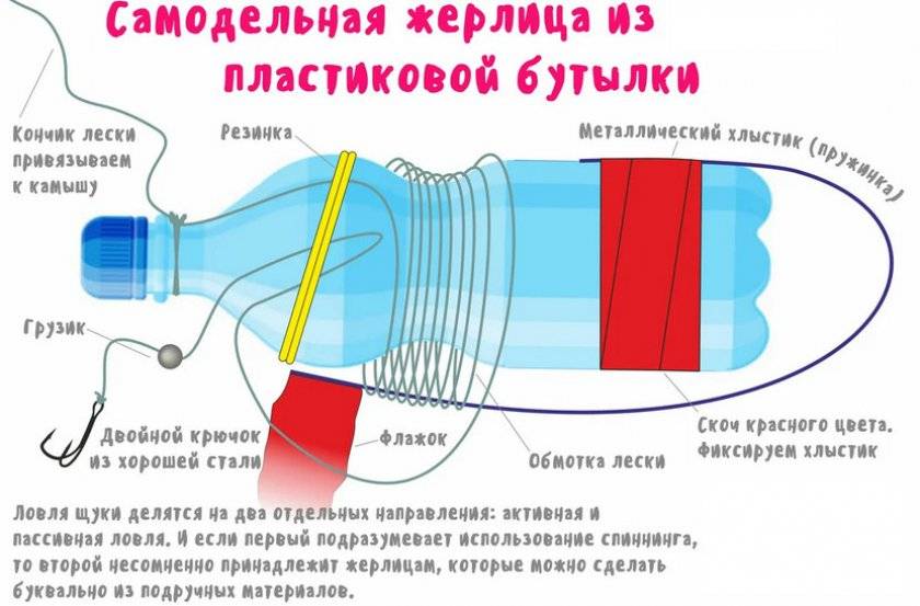 В наше время такую жерлицу для щучьей рыбалки легко сделать из небольшой пластиковой бутылки или обрезка полиэтиленовой трубки. Применяют для этого и пенопласт с полистиролом, а в качестве фиксатора лески в настоящее время все чаще используют банковские резинки для денег.