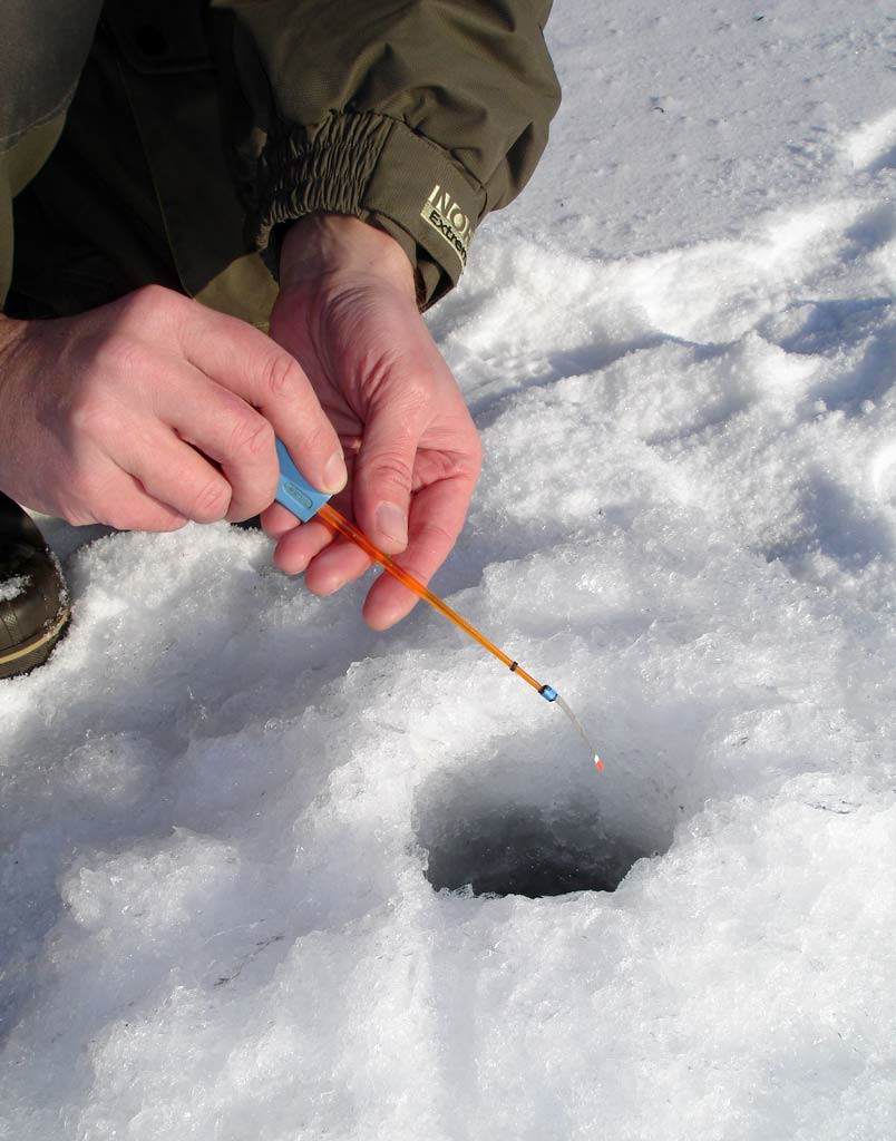 - Зажатый в рабочей руке удильник располагается почти под прямым угломк плоскости льда. Леска стравливается с желоба снасти при изгибе хлыстика удильника до выпрямления кивка (падения мормышки на дно).
