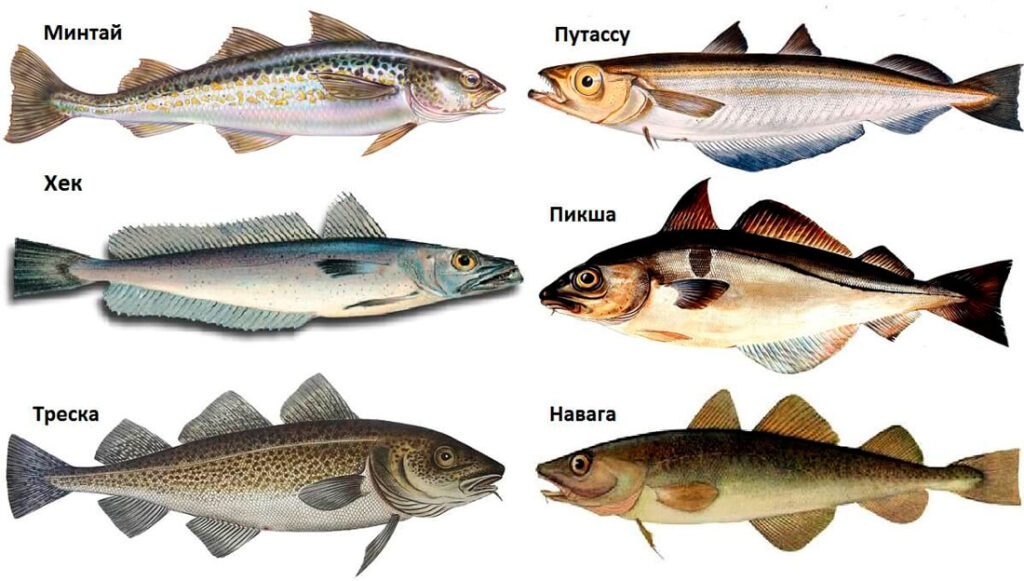 - треска (до 0,5%) — главный представитель семейства, средние размеры 45-55 см, обладает белым, сочным, мягким мясом, выраженным рыбным вкусом и ароматом;